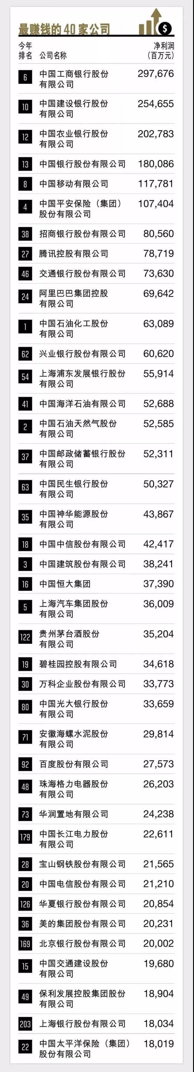 中國最賺錢的40家公司,福建僅興業銀行上榜,排名第12名。在盈利能力方面,與去年情況相同,最賺錢的10家上市公司除了幾大商業銀行和保險公司之外,仍是中國移動有限公司、騰訊控股有限公司和阿里巴巴集團控股有限公司。這十家公司在去年的總利潤達到1.46萬億,占全部上榜公司利潤總和的40.3%。