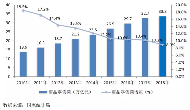 《報告》顯示,截至2018年底我國零售業經營單位2080萬個,同比增長7.8%,增速比上年加快0.9個百分點。