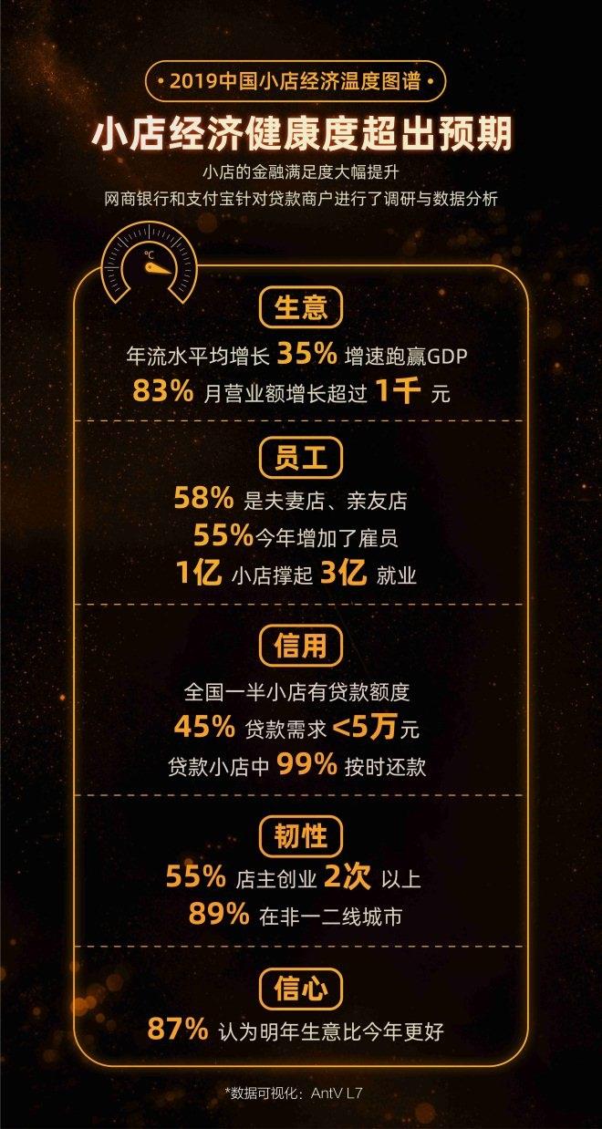 12月19日,《2019中國小店經(jīng)濟(jì)溫度圖譜》發(fā)布(以下簡稱小店圖譜)。網(wǎng)商銀行和支付寶的分析顯示,過去一年,以網(wǎng)店、街邊店、路邊攤等等組成的各類中國小店,無論是經(jīng)濟(jì)活力,還是健康程度,均超出預(yù)期: