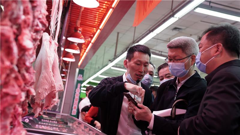 在蔬果區(qū),唐軍副局長一行掃描了黃秋葵的追溯碼,查詢黃秋葵的進(jìn)貨批次、產(chǎn)地、供應(yīng)商資質(zhì)、農(nóng)殘檢測(cè)報(bào)告及物流流轉(zhuǎn)信息,并掃描了食用農(nóng)產(chǎn)品合格證上的追溯二維碼,查詢果蔬的進(jìn)貨信息、檢測(cè)信息及物流流轉(zhuǎn)信息;在肉禽區(qū),掃碼了解了當(dāng)天進(jìn)貨批次豬肉的養(yǎng)殖基地、動(dòng)物檢疫合格證明、非洲豬瘟自檢報(bào)告及準(zhǔn)調(diào)證明等;在水產(chǎn)區(qū),掃描鯽魚追溯碼,查詢了解了鯽魚的產(chǎn)地、供應(yīng)商資質(zhì)、獸殘檢測(cè)報(bào)告、物流流轉(zhuǎn)信息及實(shí)驗(yàn)室實(shí)時(shí)監(jiān)控視頻等。