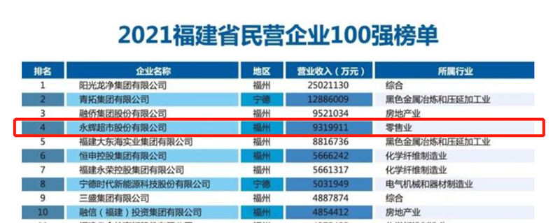 福建省企業(yè)百強榜單參照“中國企業(yè)500強”標準,是福建省經(jīng)濟建設成果的重要展示。本次百強入圍門檻是35.41億元,比上年增加17.41億元,增幅接近翻倍。永輝憑借931.99億的年營收位列榜單第4名。