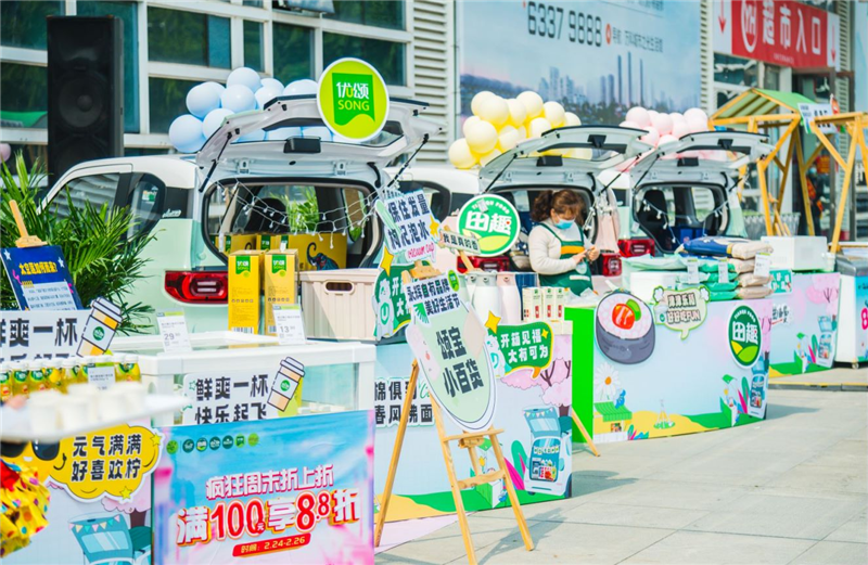其次,本次活動聯合五菱宏光MINI在福州奧體外場打造了一場極具特色的潮流后備箱市集,永輝農場草莓自由工坊、饞大獅肉食研究所、田趣福州粉絲狂吃協會、頌寶小百貨等趣味攤位紛紛亮相。讓消費者在沉浸式體驗自有品牌產品的同時,提升對品牌的認知度和認可度。