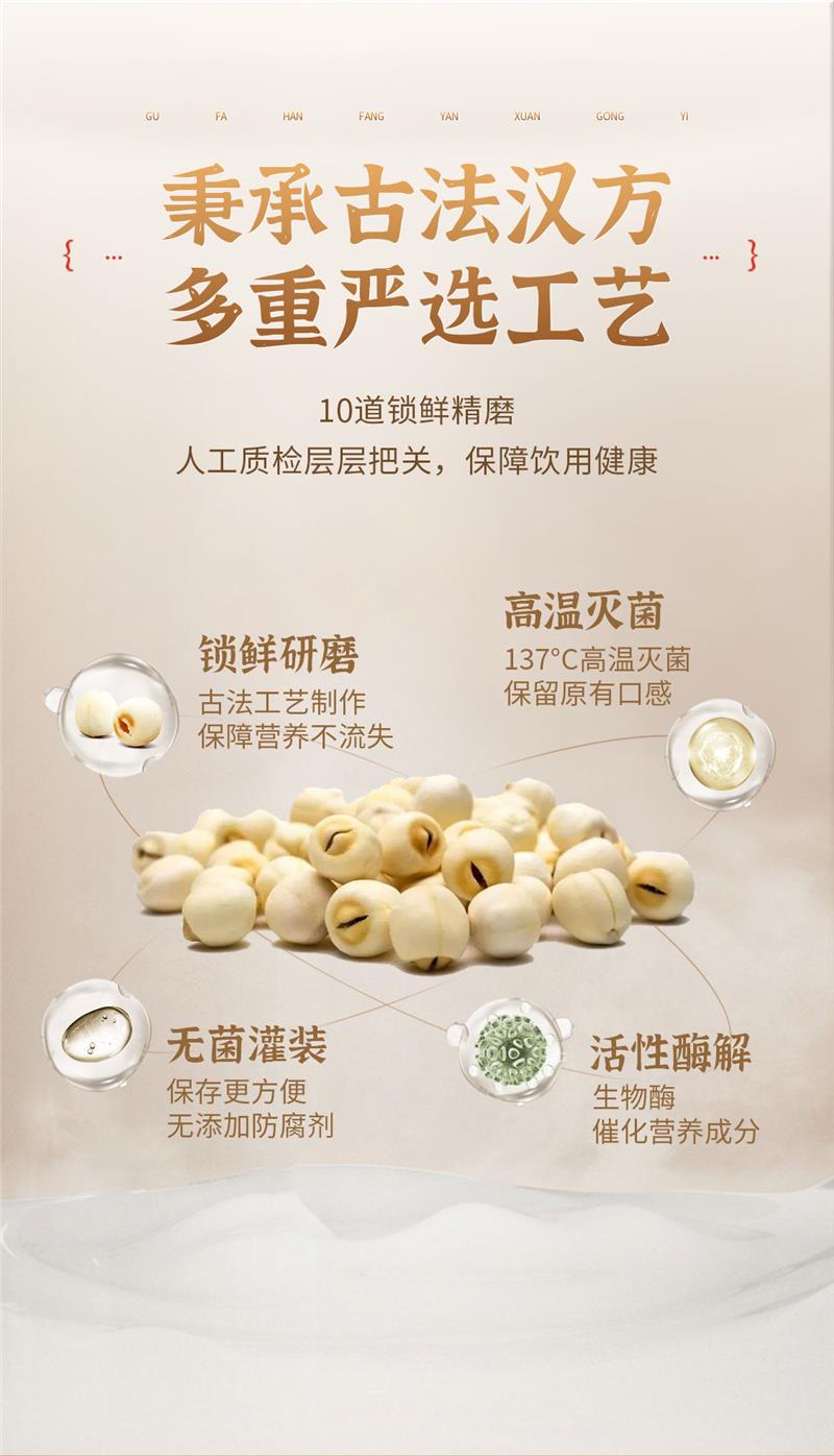 為了保證蓮子汁的純正本味和營養價值,該產品將藕粉、瓜子仁、核桃、冰糖等優選新鮮原料嚴格按照科學配比融合,通過古法調制,真正實現了0香精、0色素、0防腐劑、0脂肪、0增稠劑的五“0”主義,通過在產品上做“減法”,為消費者提供健康本味,成為低糖低卡人群的優選飲品。