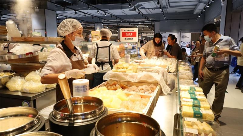 過去,不少顧客對永輝的印象更多聚焦在生鮮產品上,但現在,像奈雪的茶、張一元、瑞幸、美心、煌上煌、絕味這些熱門的品牌都出現在了公園道店的貨架上,選品更時尚,更多元。在‘老本行’生鮮方面,保留了部分顧客認可度高的商品,也增加了M5級別的安格斯牛肉、俄羅斯進口的帝王蟹等“新寵”。除了商品的調整,公園道店還有了更多“煙火氣”。門店入口處增加了特色烘焙區,6名烘焙師現場制作,推出了黑芝麻貝果、紅茶奶酥等烘焙產品。新增了“永輝食堂”,不僅能夠為顧客現場加工部分生鮮產品,還提供撈化、缽缽雞、輕食、鹵味、麻辣燙、炸串、壽司等等餐飲選擇。門店還試點了當下流行的“海鮮自助”模式,顧客可以自由挑選裝盤的海鮮,豐儉由人。